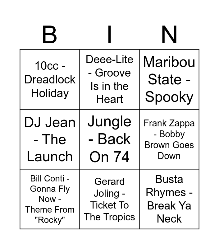 This bingo card has 30 words: Rob De Nijs - Malle Babbe, Dikke Leo - Zeepsop In De Pruimenpap, Sidney Samson - Riverside, Tame Impala - The Less I Know The Better, 10cc - Dreadlock Holiday, Maribou State - Spooky, Bill Conti - Gonna Fly Now - Theme From "Rocky", Doe Maar - 1 Nacht Alleen, Tom Waits - Closing Time, Toploader - Dancing in the Moonlight, Chumbawamba - Tubthumping, Montell Jordan - This Is How We Do It, Corona - The Rhythm of the Night, MC Hammer - U Can't Touch This, Backstreet Boys - I Want It That Way, Mac Miller - Blue World, Wheatus - Teenage Dirtbag, TOTO - Africa, Darude - Sandstorm, Jungle - Back On 74, Wes - Alane, Gorillaz - Désolé (feat. Fatoumata Diawara), Deee-Lite - Groove Is in the Heart, Busta Rhymes - Break Ya Neck, Frank Zappa - Bobby Brown Goes Down, DJ Jean - The Launch, Het Goede Doel - Belgie, Rage Against The Machine - Killing In The Name, Gerard Joling - Ticket To The Tropics and Dizzee Rascal - Bonkers.