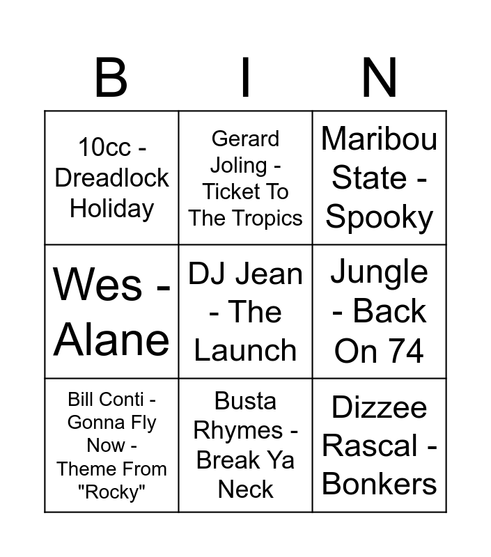 This bingo card has 30 words: Rob De Nijs - Malle Babbe, Dikke Leo - Zeepsop In De Pruimenpap, Sidney Samson - Riverside, Tame Impala - The Less I Know The Better, 10cc - Dreadlock Holiday, Maribou State - Spooky, Bill Conti - Gonna Fly Now - Theme From "Rocky", Doe Maar - 1 Nacht Alleen, MC Hammer - U Can't Touch This, Backstreet Boys - I Want It That Way, Mac Miller - Blue World, Wheatus - Teenage Dirtbag, Tom Waits - Closing Time, Toploader - Dancing in the Moonlight, Chumbawamba - Tubthumping, Montell Jordan - This Is How We Do It, Corona - The Rhythm of the Night, TOTO - Africa, Darude - Sandstorm, DJ Jean - The Launch, Het Goede Doel - Belgie, Rage Against The Machine - Killing In The Name, Gerard Joling - Ticket To The Tropics, Dizzee Rascal - Bonkers, Jungle - Back On 74, Wes - Alane, Gorillaz - Désolé (feat. Fatoumata Diawara), Deee-Lite - Groove Is in the Heart, Busta Rhymes - Break Ya Neck and Frank Zappa - Bobby Brown Goes Down.