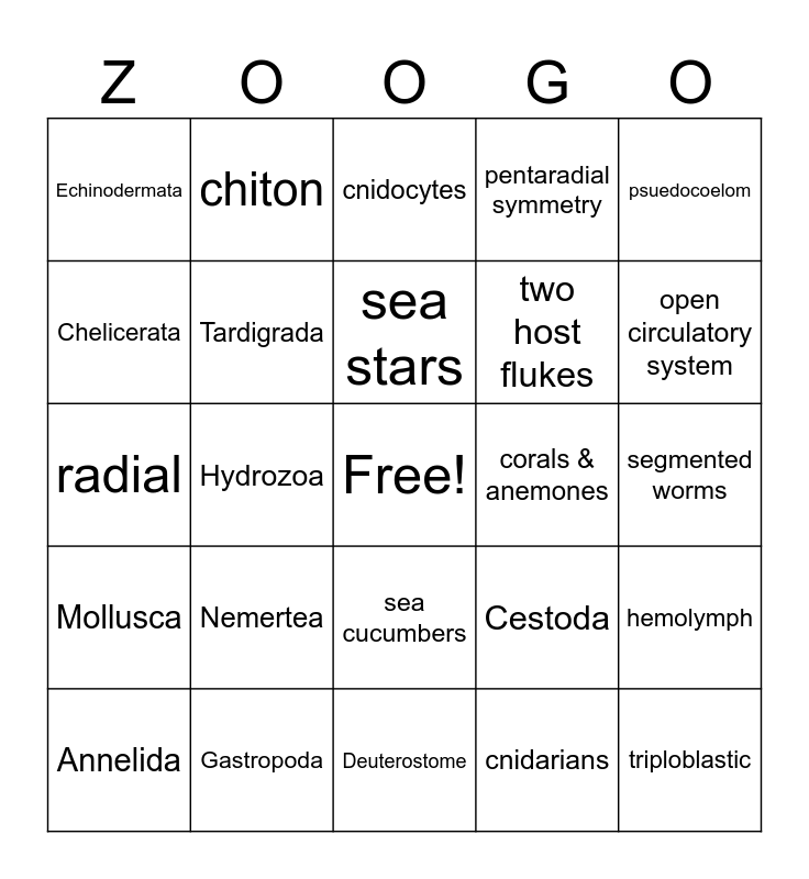 This bingo card has a free space and 24 words: Nemertea, Gastropoda, sea stars, Annelida, psuedocoelom, Echinodermata, Chelicerata, chiton, corals & anemones, sea cucumbers, two host flukes, radial, Cestoda, hemolymph, Tardigrada, cnidarians, segmented worms, cnidocytes, open circulatory system, Hydrozoa, triploblastic, Mollusca, pentaradial symmetry and Deuterostome.