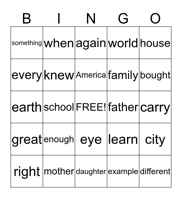 This bingo card has a free space and 24 words: enough, mother, America, right, house, something, every, when, father, eye, family, earth, learn, city, knew, example, carry, again, bought, school, different, great, world and daughter.