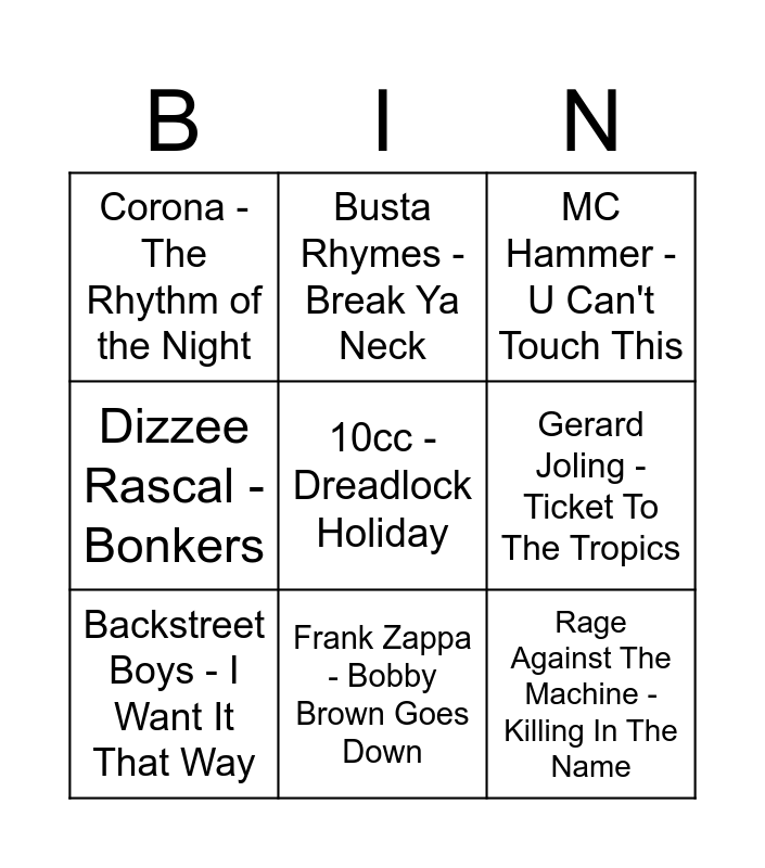 This bingo card has 30 words: Maribou State - Spooky, Toploader - Dancing in the Moonlight, Chumbawamba - Tubthumping, Montell Jordan - This Is How We Do It, Corona - The Rhythm of the Night, MC Hammer - U Can't Touch This, Backstreet Boys - I Want It That Way, Bill Conti - Gonna Fly Now - Theme From "Rocky", Doe Maar - 1 Nacht Alleen, Tom Waits - Closing Time, Mac Miller - Blue World, Het Goede Doel - Belgie, Wes - Alane, Darude - Sandstorm, Jungle - Back On 74, Rob De Nijs - Malle Babbe, Dikke Leo - Zeepsop In De Pruimenpap, Sidney Samson - Riverside, Tame Impala - The Less I Know The Better, 10cc - Dreadlock Holiday, Gorillaz - Désolé (feat. Fatoumata Diawara), Deee-Lite - Groove Is in the Heart, Busta Rhymes - Break Ya Neck, Rage Against The Machine - Killing In The Name, Gerard Joling - Ticket To The Tropics, Dizzee Rascal - Bonkers, Wheatus - Teenage Dirtbag, TOTO - Africa, Frank Zappa - Bobby Brown Goes Down and DJ Jean - The Launch.