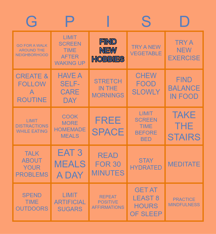 This bingo card has a free space and 24 words: EAT 3 MEALS A DAY, LIMIT ARTIFICIAL SUGARS, STRETCH IN THE MORNINGS, SPEND TIME OUTDOORS, TRY A NEW EXERCISE, GO FOR A WALK AROUND THE NEIGHBORHOOD, CREATE & FOLLOW A ROUTINE, LIMIT SCREEN TIME AFTER WAKING UP, LIMIT SCREEN TIME BEFORE BED, READ FOR 30 MINUTES, CHEW FOOD SLOWLY, LIMIT DISTRACTIONS WHILE EATING, STAY HYDRATED, MEDITATE, HAVE A SELF-CARE DAY, GET AT LEAST 8 HOURS OF SLEEP, TAKE THE STAIRS, FIND NEW HOBBIES, FIND BALANCE IN FOOD, COOK MORE HOMEMADE MEALS, PRACTICE MINDFULNESS, TALK ABOUT YOUR PROBLEMS, TRY A NEW VEGETABLE and REPEAT POSITIVE AFFIRMATIONS.