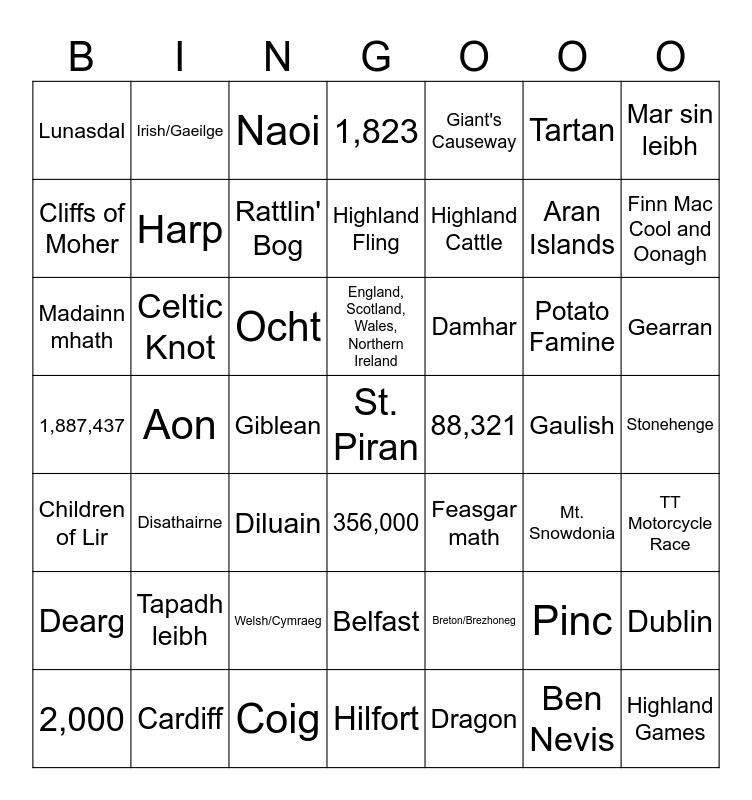 This bingo card has 134 words: Free!, 356,000, Breton/Brezhoneg, Carnac Alighnments, France, St. Anne, Celtic Knot, Cornish and Manx, Gaulish, Hilfort, Iron Age, Roundhouse, 2,000, Bosigran Castle, Cornish/Kernewek, England, St. Piran, London, Queen Boudicca, River Thames, Stonehenge, 1,887,437, Aran Islands, Book of Kells, Carrauntoohill, Children of Lir, Cliffs of Moher, Dublin, Emerald Isle, Euro, Harp, Irish/Gaeilge, Potato Famine, Rattlin' Bog, Ring of Kerry, River Shannon, Riverdance, Shamrock, St. Patrick, Tír na nÓg, the Land of Youth, 1,823, Douglas, Manx/Gaelg, St. Maughold, Triskelion, TT Motorcycle Race, Tynwald - 979 A.D., Belfast, Finn Mac Cool and Oonagh, Giant's Causeway, Loch Neagh, 88,321, Bagpipes, Battle of Culloden, Beltane Fire Festival, Ben Nevis, Benandonner, Edinbrough, Haggis, Highland Cattle, Highland Fling, Highland Games, Kilt, Loch Lomond, Loch Ness, Orkney, Shetland, Hebrides, Robert Burns, Scottish Gaelic, St. Andrew, Tartan, England, Scotland, Wales, England, Scotland, Wales, Northern Ireland, Oxford, Cambridge, Trinity, St. Andrews, Glasgow, Aberdeen, Edinburgh, Pound, Severn River, 947,000, Cardiff, Dragon, Mt. Snowdonia, St. David, Welsh/Cymraeg, Meal do naidheachd en-diugh, Halo, Madainn mhath, Feasgar math, Cia mar atha thu?, Is mise ________., Mas e ur toile, Tapadh leibh, Se ur betha, Mar sin leibh, Sneachd, Ubhal, A naid, Aon, Da, Tri, Ceithir, Coig, Se, Seachd, Ocht, Naoi, Deich, Diluain, Dimart, Diciadain, Diardaoin, Dihaoine, Disathairne, Didomhnaich, Faoilteach, Gearran, Mart, Giblean, Ceitean, Og-mhios, Iuchar, Lunasdal, Sultainn, Damhar, Samhainn, Dudlachd, Dearg, Orains, Buidhe, Uaine, Gorm, Purpaidh, Pinc, Donn, Ban, Liath and Dubh.