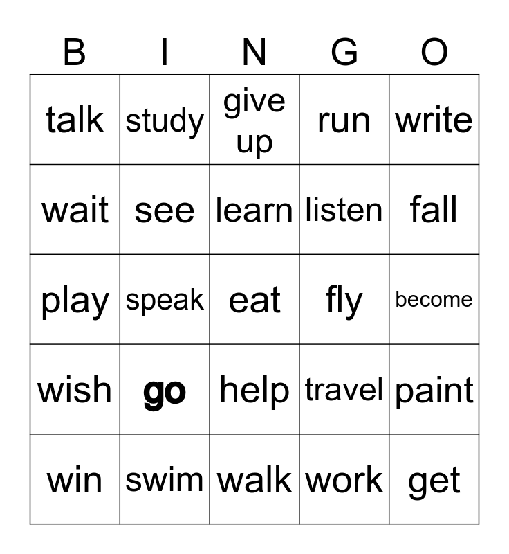 This bingo card has a free space and 24 words: go, swim, learn, win, write, talk, wait, study, fly, help, listen, play, travel, paint, see, work, become, give up, fall, speak, get, wish, run and walk.