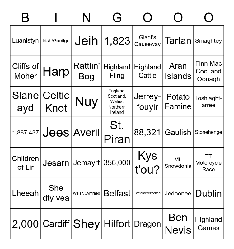 This bingo card has 133 words: Free!, 356,000, Breton/Brezhoneg, Carnac Alighnments, France, St. Anne, Celtic Knot, Cornish and Manx, Gaulish, Hilfort, Iron Age, Roundhouse, 2,000, Bosigran Castle, Cornish/Kernewek, England, St. Piran, London, Queen Boudicca, River Thames, Stonehenge, 1,887,437, Aran Islands, Book of Kells, Carrauntoohill, Children of Lir, Cliffs of Moher, Dublin, Emerald Isle, Euro, Harp, Irish/Gaeilge, Potato Famine, Rattlin' Bog, Ring of Kerry, River Shannon, Riverdance, Shamrock, St. Patrick, Tír na nÓg, the Land of Youth, 1,823, Douglas, Manx/Gaelg, St. Maughold, Triskelion, TT Motorcycle Race, Tynwald - 979 A.D., Belfast, Finn Mac Cool and Oonagh, Giant's Causeway, Loch Neagh, 88,321, Bagpipes, Battle of Culloden, Beltane Fire Festival, Ben Nevis, Benandonner, Edinbrough, Haggis, Highland Cattle, Highland Fling, Highland Games, Kilt, Loch Lomond, Loch Ness, Orkney, Shetland, Hebrides, Robert Burns, Scottish Gaelic, St. Andrew, Tartan, England, Scotland, Wales, England, Scotland, Wales, Northern Ireland, Oxford, Cambridge, Trinity, St. Andrews, Glasgow, Aberdeen, Edinburgh, Pound, Severn River, 947,000, Cardiff, Dragon, Mt. Snowdonia, St. David, Welsh/Cymraeg, Ta shui, Moghrey mie, Slane ayd, Kys t'ou?, Mish _______, My saillt, Gura mie ayd, She dty vea, Slan lhait, Sniaghtey, Ooyl, Neu-nhee, Nane, Jees, Tree, Kiare, Queig, Shey, Shiacht, Hoght, Nuy, Jeih, Jelune, Jemayrt, Jecrean, Jerdein, Jeheiney, Jesarn, Jedoonee, Jerrey-geuree, Toshiaght-arree, Mayrnt, Averil, Boaldyn, Mean-souree, Jerrey-souree, Luanistyn, Mean-fouyir, Jerrey-fouyir, Mee Houney, Mee ny Nollick, Jiarg, Jiarg-Bwee, Bwee, Geanyney, Gorrym, Gorrym-Jiarg, Jiarg-Bane, Dhone, Bane, Lheeah and Doo.