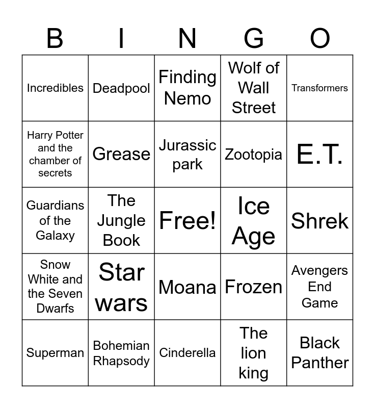 This bingo card has a free space and 42 words: Dark knight, Jurassic park, Titanic, Star wars, The lion king, Avengers End Game, Black Panther, Inside Out, Finding Nemo, Moana, Shrek, E.T., The Jungle Book, Transformers, Toy story, Frozen, Despicable Me, Guardians of the Galaxy, Forrest Gump, Deadpool, Harry Potter and the chamber of secrets, Jaws, Captain Marvel, Incredibles, Top Gun: Maverick, Aladdin, Zootopia, The Hunger Games, Joker, Alice in Wonderland, Indiana Jones, Snow White and the Seven Dwarfs, Grease, Cinderella, Beauty and the Beast, Superman, Bohemian Rhapsody, Ice Age, Venom, Wonder Woman, Wolf of Wall Street and The Notebook.