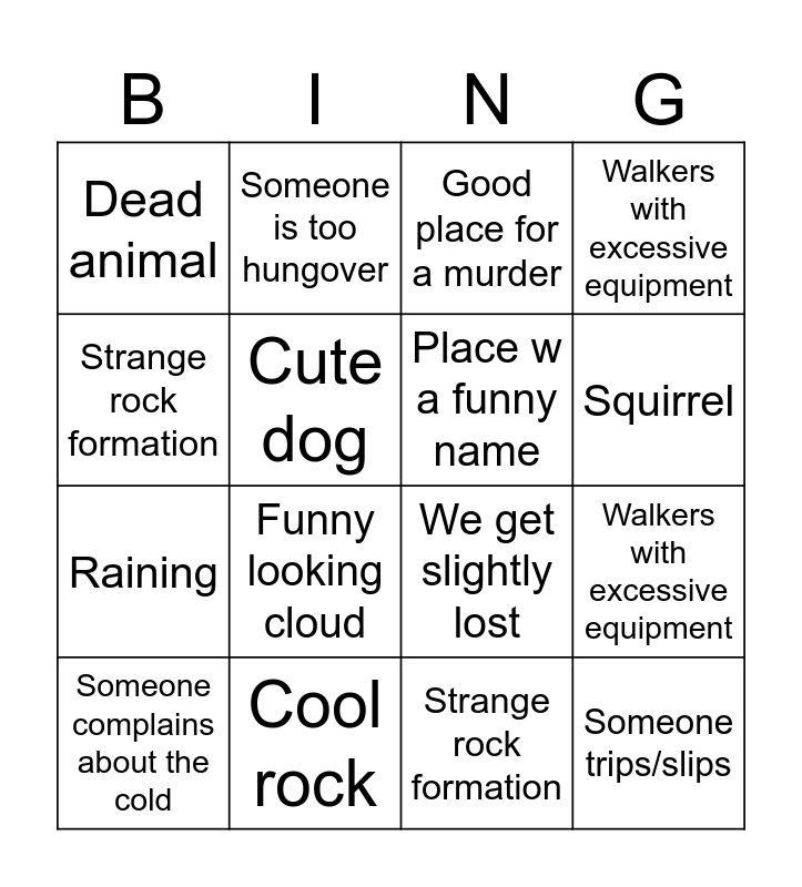 This bingo card has 20 words: Walkers with excessive equipment, Good place to hide a body, Good place for a murder, Muddy dog, Someone complains about the cold, Strange rock formation, Cool rock, Dead animal, Raining, Someone is too hungover, Funny looking cloud, We get slightly lost, Cute dog, Someone trips/slips, Place w a funny name, Squirle, Squirrel, Walkers with excessive equipment, Strange rock formation and We get slightly lost.