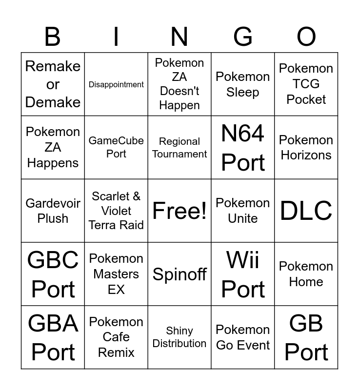 This bingo card has a free space and 24 words: Pokemon Masters EX, Pokemon Cafe Remix, Regional Tournament, GBA Port, Pokemon TCG Pocket, Remake or Demake, Pokemon ZA Happens, Disappointment, Pokemon Unite, Spinoff, N64 Port, Gardevoir Plush, Wii Port, Pokemon Home, GameCube Port, Pokemon Go Event, DLC, Pokemon ZA Doesn't Happen, Pokemon Horizons, Scarlet & Violet Terra Raid, GB Port, GBC Port, Pokemon Sleep and Shiny Distribution.