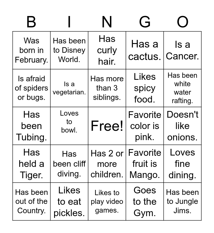 This bingo card has a free space and 24 words: Has been cliff diving., Likes to eat pickles., Has more than 3 siblings., Has been out of the Country., Is a Cancer., Was born in February., Is afraid of spiders or bugs., Has been to Disney World., Favorite color is pink., Has 2 or more children., Likes spicy food., Has been Tubing., Favorite fruit is Mango., Loves fine dining., Is a vegetarian., Goes to the Gym., Doesn't like onions., Has curly hair., Has been white water rafting., Loves to bowl., Has been to Jungle Jims., Has held a Tiger., Has a cactus. and Likes to play video games..