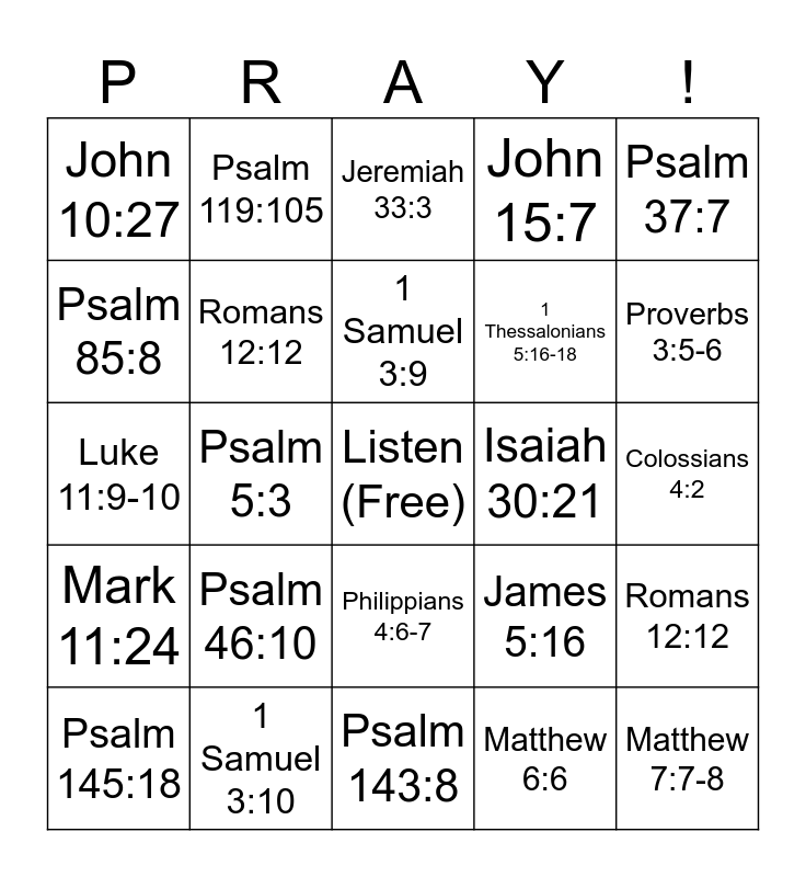 This bingo card has a free space and 24 words: Psalm 46:10, 1 Samuel 3:10, 1 Samuel 3:9, Psalm 145:18, Psalm 37:7, John 10:27, Psalm 85:8, Psalm 119:105, Isaiah 30:21, Philippians 4:6-7, 1 Thessalonians 5:16-18, Luke 11:9-10, James 5:16, Romans 12:12, Romans 12:12, Matthew 6:6, Colossians 4:2, Jeremiah 33:3, Proverbs 3:5-6, Psalm 5:3, Matthew 7:7-8, Mark 11:24, John 15:7 and Psalm 143:8.