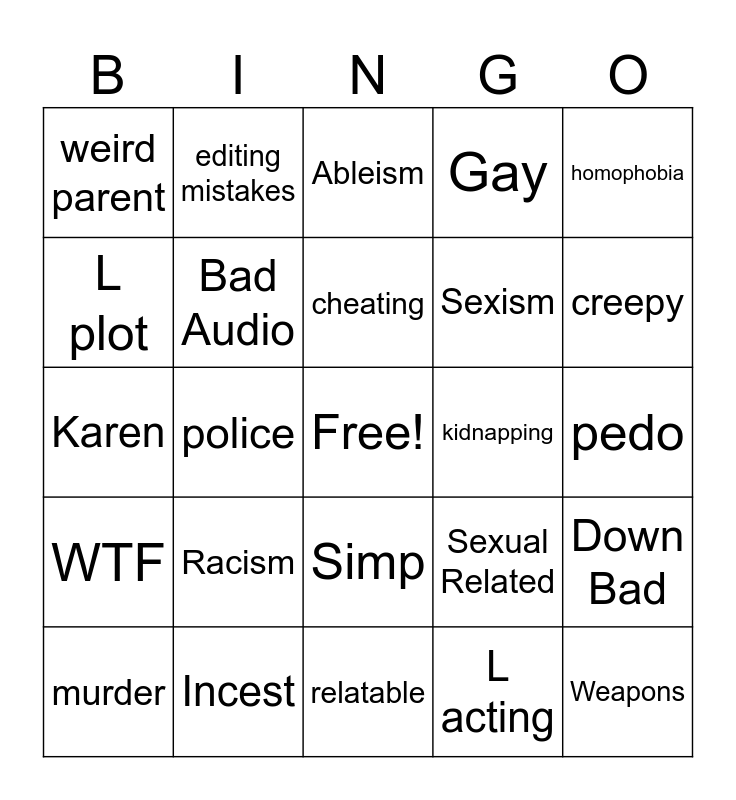 This bingo card has a free space and 24 words: Racism, Incest, cheating, murder, homophobia, weird parent, L plot, editing mistakes, kidnapping, Simp, Sexism, Karen, Sexual Related, Down Bad, Bad Audio, L acting, pedo, Ableism, creepy, police, Weapons, WTF, Gay and relatable.