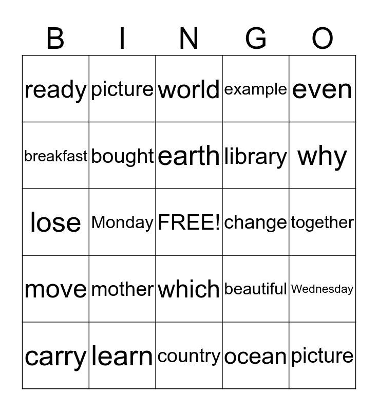 This bingo card has a free space and 24 words: mother, learn, earth, carry, even, ready, breakfast, picture, change, which, library, lose, beautiful, Wednesday, bought, ocean, together, world, why, Monday, picture, move, example and country.