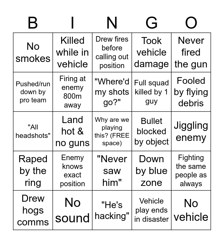 This bingo card has a free space and 41 words: Cheney rock placement, "All headshots", Lost a fight due to railing, Firing at enemy 800m away, No sound, "Never saw him", "Where'd my shots go?", Shot from behind, Never fired the gun, Raped by the ring, Land hot & no guns, Took vehicle damage, No vehicle, Jiggling enemy, Bullet blocked by object, Enemy knows exact position, Killed by precision nade, No smokes, Slurs, Drew fires before calling out position, Fighting the same people as always, Orc, "He's hacking", Full squad killed by 1 guy, "How is he alive?", "Did anyone land here?", Vehicle play ends in disaster, Flare does nothing, Fooled by flying debris, 1st gun is M16 upon landing, Killed through smoke, Killed while in vehicle, Drew hogs comms, Chicken dinner, Down by blue zone, Pushed/run down by pro team, Absolutely decked so time to lose, Drew last in the vehicle, Drew begging for loot, Parachute doesn't work and Friendly fire.