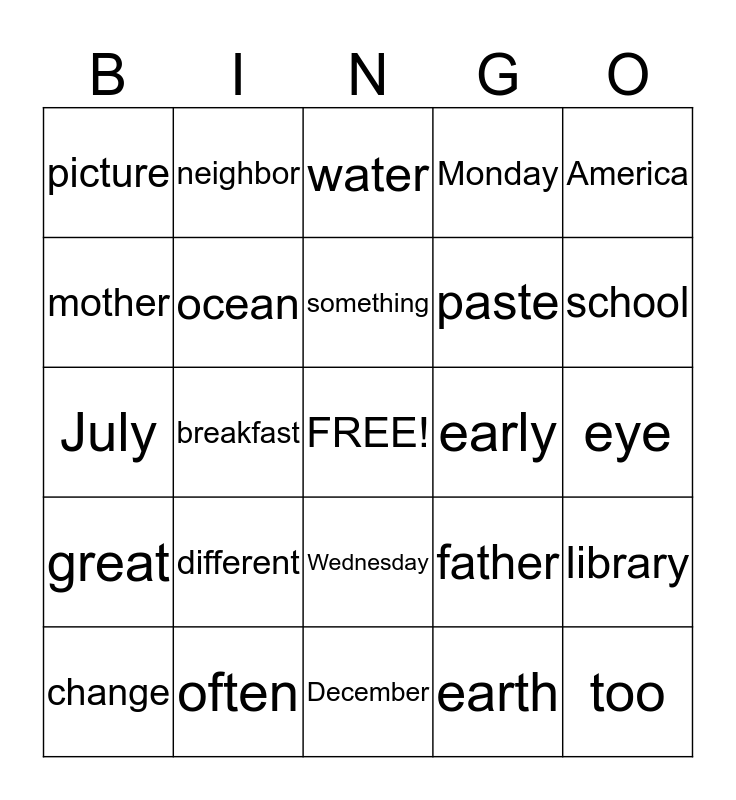 This bingo card has a free space and 24 words: different, often, something, change, America, picture, mother, neighbor, early, Wednesday, paste, July, father, library, ocean, earth, eye, water, school, breakfast, too, great, Monday and December.