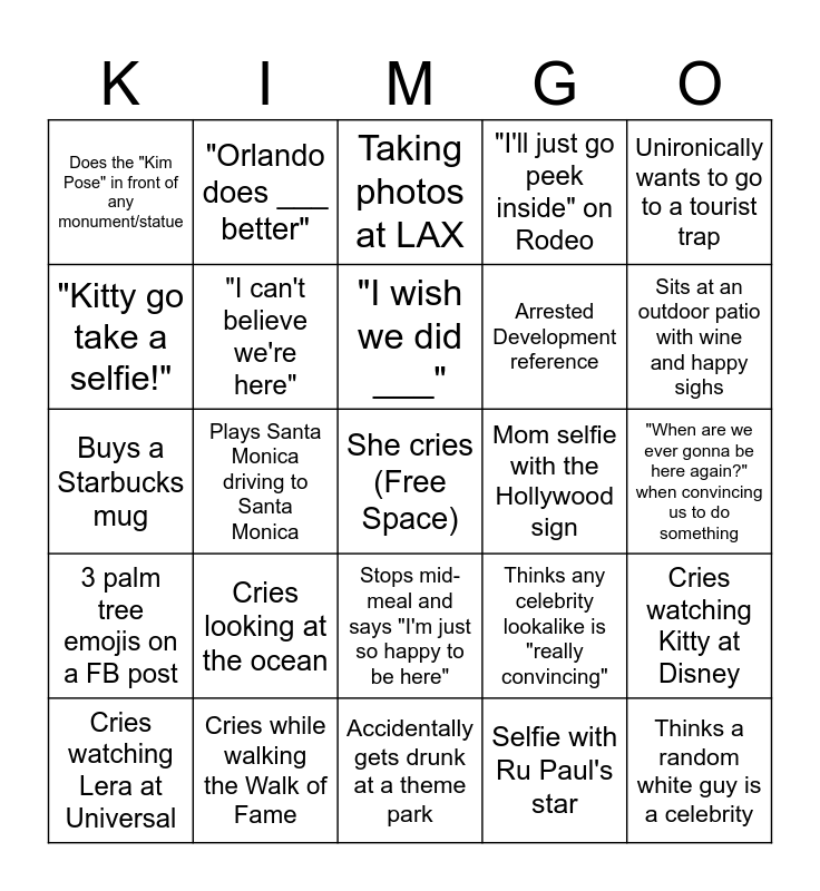 This bingo card has a free space and 24 words: Cries looking at the ocean, Cries while walking the Walk of Fame, "I wish we did ___", Cries watching Lera at Universal, Unironically wants to go to a tourist trap, Does the "Kim Pose" in front of any monument/statue, "Kitty go take a selfie!", "Orlando does ___ better", Mom selfie with the Hollywood sign, Stops mid-meal and says "I'm just so happy to be here", Arrested Development reference, Buys a Starbucks mug, Thinks any celebrity lookalike is "really convincing", Cries watching Kitty at Disney, "I can't believe we're here", Selfie with Ru Paul's star, "When are we ever gonna be here again?" when convincing us to do something, Taking photos at LAX, Sits at an outdoor patio with wine and happy sighs, Plays Santa Monica driving to Santa Monica, Thinks a random white guy is a celebrity, 3 palm tree emojis on a FB post, "I'll just go peek inside" on Rodeo and Accidentally gets drunk at a theme park.