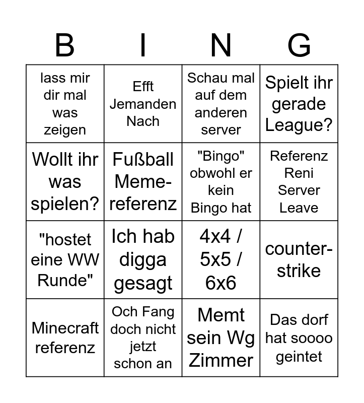 This bingo card has 16 words: Och Fang doch nicht jetzt schon an, counter-strike, Schau mal auf dem anderen server, lass mir dir mal was zeigen, "hostet eine WW Runde", Efft Jemanden Nach, 4x4 / 5x5 / 6x6, Memt sein Wg Zimmer, Wollt ihr was spielen?, Fußball Meme-referenz, Minecraft referenz, Spielt ihr gerade League?, Ich hab digga gesagt, Referenz Reni Server Leave, "Bingo" obwohl er kein Bingo hat and Das dorf hat soooo geintet.