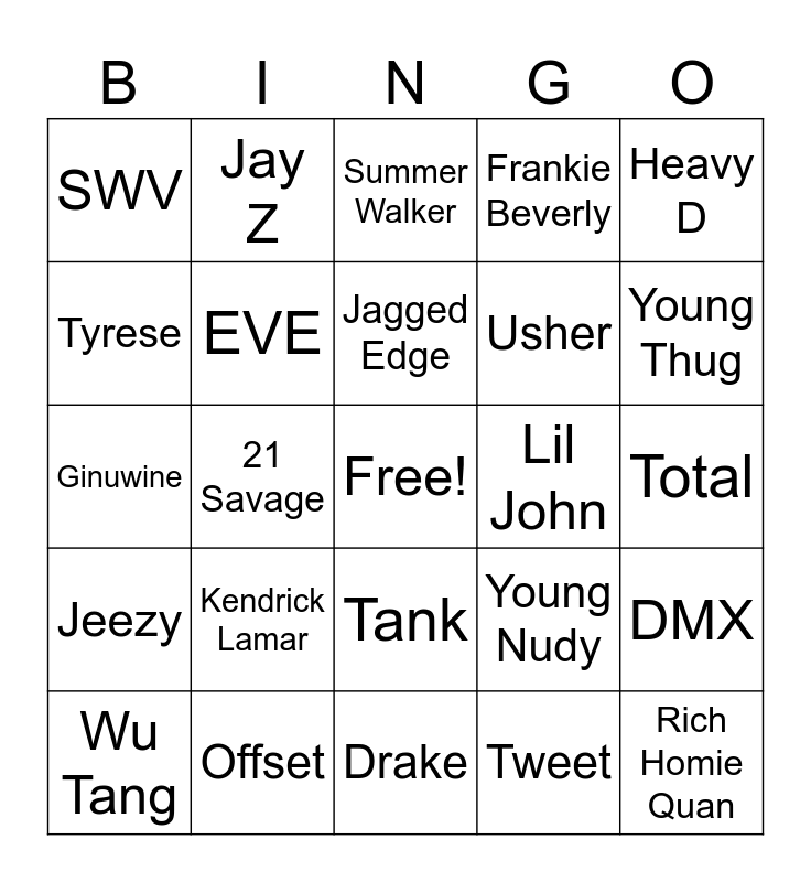 This bingo card has a free space and 29 words: Wu Tang, Mario, 21 Savage, Money Bag Yo, SWV, Summer Walker, EVE, Kendrick Lamar, Lil John, Offset, Total, Rich Homie Quan, Drake, Tweet, Young Thug, Foxy Brown, Tank, Jeezy, Heavy D, Ginuwine, Young Nudy, Tevin Cambell, Usher, Tyrese, Frankie Beverly, Jay Z, DMX, Jagged Edge and Migos.