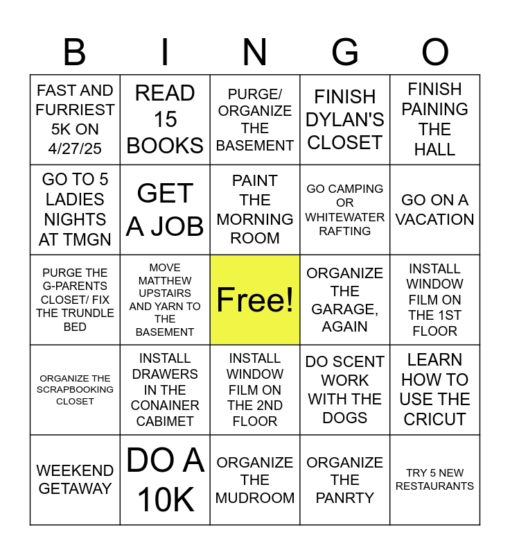 This bingo card has a free space and 24 words: INSTALL DRAWERS IN THE CONAINER CABIMET, DO A 10K, PAINT THE MORNING ROOM, WEEKEND GETAWAY, FINISH PAINING THE HALL, FAST AND FURRIEST 5K ON 4/27/25, GO TO 5 LADIES NIGHTS AT TMGN, READ 15 BOOKS, ORGANIZE THE GARAGE, AGAIN, INSTALL WINDOW FILM ON THE 2ND FLOOR, GO CAMPING OR WHITEWATER RAFTING, PURGE THE G-PARENTS CLOSET/ FIX THE TRUNDLE BED, DO SCENT WORK WITH THE DOGS, LEARN HOW TO USE THE CRICUT, GET A JOB, ORGANIZE THE PANRTY, INSTALL WINDOW FILM ON THE 1ST FLOOR, PURGE/ ORGANIZE THE BASEMENT, GO ON A VACATION, MOVE MATTHEW UPSTAIRS AND YARN TO THE BASEMENT, TRY 5 NEW RESTAURANTS, ORGANIZE THE SCRAPBOOKING CLOSET, FINISH DYLAN'S CLOSET and ORGANIZE THE MUDROOM.