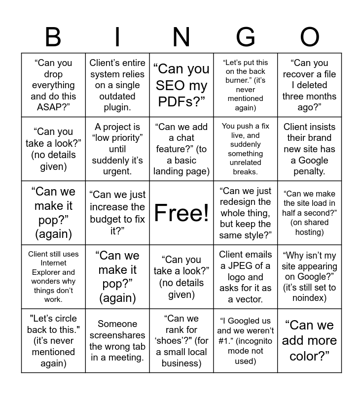 This bingo card has a free space and 52 words: “Can we make the site load in half a second?” (on shared hosting), “Can we add more color?”, “Can we just move this button 2 pixels to the left?”, “Can we rank for ‘shoes’?" (for a small local business), “Can we make it pop?” (again), “Can we add more whitespace but also more content?”, Client’s entire system relies on a single outdated plugin., “Can we make the site load in half a second?” (on shared hosting), “Can you take a look?” (no details given), “Let’s circle back to this.” (it’s never mentioned again), A project is “low priority” until suddenly it’s urgent., Client pauses ads and asks why leads stopped., “Why isn’t my site appearing on Google?” (it’s still set to noindex), Client emails a JPEG of a logo and asks for it as a vector., Someone pastes an obvious phishing email into Slack asking, “Is this real?”, “Can we make it pop?” (again), “Can we add a chat feature?” (to a basic landing page), “Can we just redesign the whole thing, but keep the same style?”, “Google is out to get us.”, “Can you recover a file I deleted three months ago?”, “Can we just increase the budget to fix it?”, “I Googled us and we weren’t #1.” (incognito mode not used), “Can you drop everything and do this ASAP?”, You push a fix live, and suddenly something unrelated breaks., “Can we integrate this random software I found?”, Someone spills coffee on their keyboard… again., “Can we make it pop?” (again), “Can we spend $100 and get 10,000 leads?”, Client insists their brand new site has a Google penalty., “Can we have five different versions to choose from?”, “The CEO’s spouse doesn’t like it.”, “Let’s put this on the back burner.” (it’s never mentioned again), “I’m swamped, but I can squeeze this in.”, “Can we just move this button 2 pixels to the left?”, “Why isn’t my site ranking yet? It’s been two days.”, “Can you SEO my PDFs?”, Someone screenshares the wrong tab in a meeting., “Let’s circle back to this.” (it’s never mentioned again), “Can we rank for ‘shoes’?" (for a small local business), “We need a new logo, but keep the old one.”, “It just doesn’t feel right. I can’t explain why.”, “Can we make the site load in half a second?” (on shared hosting), Client still uses Internet Explorer and wonders why things don’t work., “Can we bid on competitor names?” (ignores legal risks), “Can you take a look?” (no details given), Someone forgets they’re not on mute during a meeting., A WordPress update breaks everything., “Can we make it pop?” (again), “Can we just increase the budget to fix it?”, “Can we just move this button 2 pixels to the left?”, "Let’s circle back to this." (it’s never mentioned again) and “Can we recover a file I deleted three months ago?”.