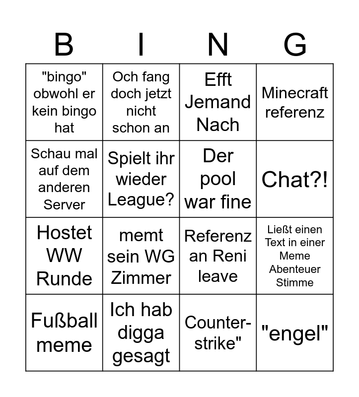 This bingo card has 16 words: Ich hab digga gesagt, Ließt einen Text in einer Meme Abenteuer Stimme, Efft Jemand Nach, "bingo" obwohl er kein bingo hat, Hostet WW Runde, Och fang doch jetzt nicht schon an, Referenz an Reni leave, Counter-strike", Schau mal auf dem anderen Server, Spielt ihr wieder League?, Fußball meme, Minecraft referenz, memt sein WG Zimmer, Chat?!, Der pool war fine and "engel".