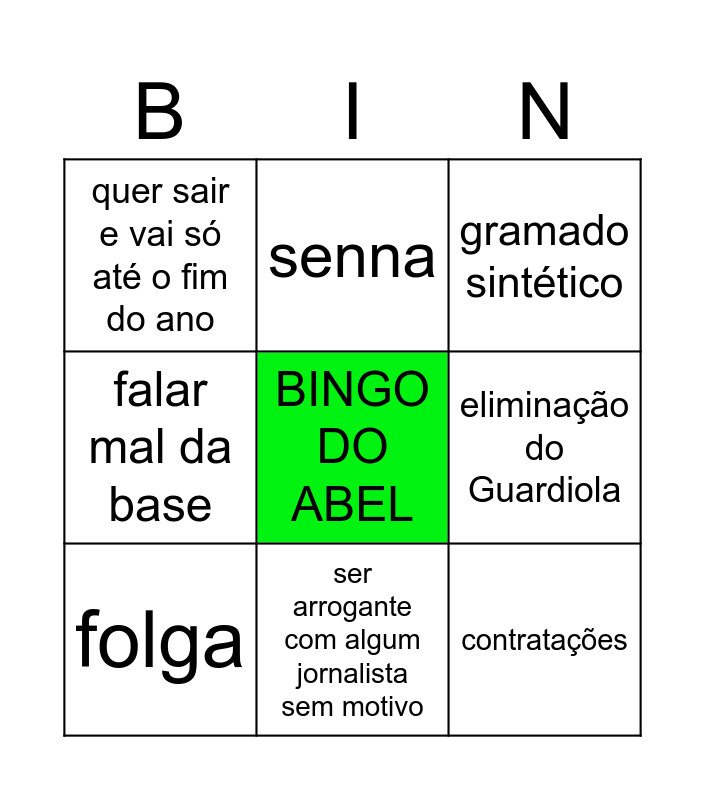 This bingo card has a free space and 8 words: eliminação do Guardiola, gramado sintético, senna, folga, quer sair e vai só até o fim do ano, contratações, falar mal da base and ser arrogante com algum jornalista sem motivo.