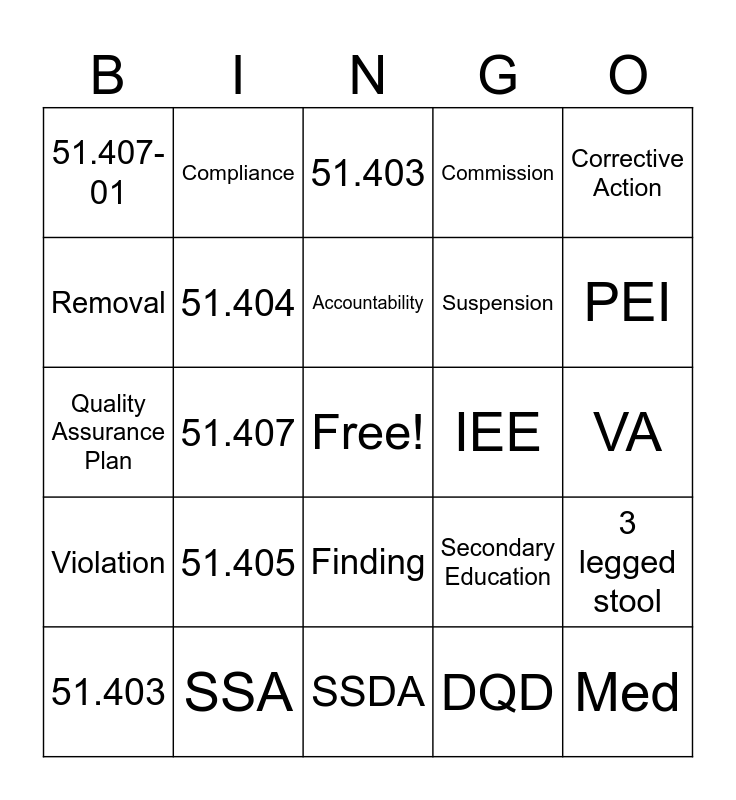 This bingo card has a free space and 29 words: 51.403, 51.400, 51.407, 51.402, 51.407-01, 51.403, 51.404, 51.405, IEE, SSA, VA, Med, SSDA, DQD, PEI, PEA, Finding, Violation, Corrective Action, Quality Assurance Plan, Secondary Education, 51.401, Suspension, Removal, Commission, Compliance, 3 legged stool, Accountability and ROM.