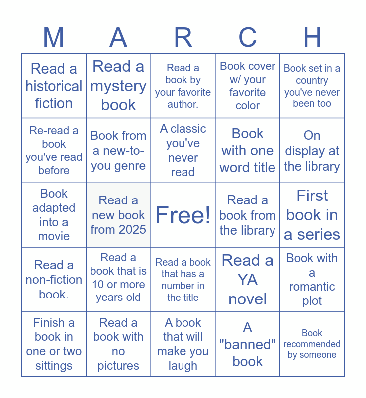 This bingo card has a free space and 24 words: Finish a book in one or two sittings, Read a book that is 10 or more years old, A classic you've never read, A "banned" book, Book set in a country you've never been too, Read a historical fiction, Read a mystery book, Read a book by your favorite author., Read a book from the library, First book in a series, Book adapted into a movie, Book from a new-to-you genre, Read a YA novel, Book with a romantic plot, Re-read a book you've read before, Read a book with no pictures, A book that will make you laugh, Book cover w/ your favorite color, On display at the library, Read a non-fiction book., Read a new book from 2025, Read a book that has a number in the title, Book with one word title and Book recommended by someone.