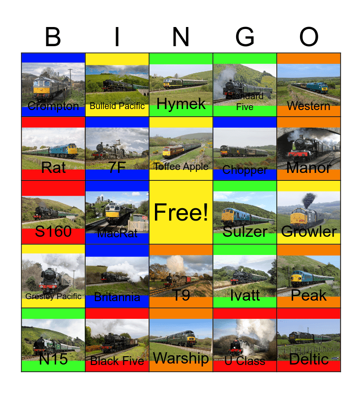 This bingo card has 24 images, a free space and 24 words: Britannia, Black Five, Toffee Apple, N15, Western, Crompton, Rat, Bulleid Pacific, Sulzer, T9, Chopper, S160, Ivatt, Peak, 7F, U Class, Growler, Hymek, Manor, MacRat, Deltic, Gresley Pacific, Standard Five and Warship.