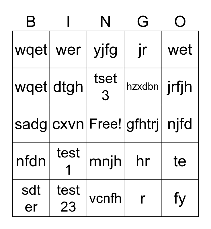 This bingo card has a free space and 24 words: test 1, test 23, tset 3, sdt er, wet, wqet, wqet, wer, gfhtrj, mnjh, hzxdbn, sadg, hr, te, dtgh, r, njfd, yjfg, jrfjh, cxvn, fy, nfdn, jr and vcnfh.