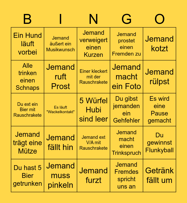 This bingo card has 26 words: Jemand trägt eine Mütze, Jemand muss pinkeln, Einer kleckert mit der Rauschrakete, Jemand Fremdes spricht uns an, Jemand kotzt, Ein Hund läuft vorbei, Jemand ruft Prost, Jemand verweigert einen Kurzen, Jemand macht ein Foto, Getränk fällt um, Alle trinken einen Schnaps, Es läuft "Wackelkontakt", Jemand furzt, Jemand macht einen Trinkspruch, Es wird eine Pause gemacht, Jemand pisst mitten auf den Weg, Jemand äußert ein Musikwunsch, Jemand ext V/A mit Rauschrakete, Jemand prostet einen Fremden zu, Du gewinnst Flunkyball, Du ext ein Bier mit Rauschrakete, Jemand fällt hin, 5 Würfel Hubi sind leer, Du gibst jemanden ein Gehfehler, Jemand rülpst and Du hast 5 Bier getrunken.