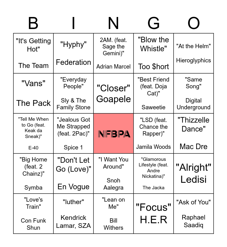 This bingo card has a free space and 42 words: "Anniversary" Tony! Toni! Toné!, "Closer" Goapele, "Heaven Sent" Keyshia Cole, "Don't Let Go (Love)" En Vogue, "Focus" H.E.R, "Alright" Ledisi, "Ask of You" Raphael Saadiq, "Music" Leela James, 2AM. (feat. Sage the Gemini)" Adrian Marcel, "I Want You Around" Snoh Aalegra, "Thizzelle Dance" Mac Dre, "Same Song" Digital Underground, "Jealous Got Me Strapped (feat. 2Pac)" Spice 1, "At the Helm" Hieroglyphics, "93 'Til Infinity" Souls of Mischief, "Glamorous Lifestyle (feat. Andre Nickatina)" The Jacka, "Ayo for Yayo (feat. San Quinn)" Andre Nickatina, "Tell Me When to Go (feat. Keak da Sneak)" E-40, "N.E.W Oakland (feat. G-Stack & Bavgate)" Mistah F.AB., "Hyphy" Federation, "Vans" The Pack, "The Sideshow (Featuring Too $hort & Mistah F.A.B." Traxamillion, "3 Freaks (feat. Mistah F.A.B., Turf Talk & Keak da Sneak" DJ Shadow, "It's Getting Hot" The Team, "Get Right" Mac Mall, "Windows (feat. Quavo & Tyga)" Kamaiyah, "Best Friend (feat. Doja Cat)" Saweetie, "About You" Blxst, "Wait on Me" Larry June, "Moonwalk" Rexx Life Raj, Kenny Beats, "Canadian Goose" ALLBLACK, "Big Home (feat. 2 Chainz)" Symba, "Everyday People" Sly & The Family Stone, "Lean on Me" Bill Withers, "Fat Cats, Bigga Fish" The Coup, "Love's Train" Con Funk Shun, "luther" Kendrick Lamar, SZA, "LSD (feat. Chance the Rapper)" Jamila Woods, "California Love (feat. Roger Troutman & Dr. Dre)" 2Pac, "Choices (Yup)" E-40, "Blow the Whistle" Too $hort and "I Got 5 On it (feat. Michael Marshall)" Luniz.