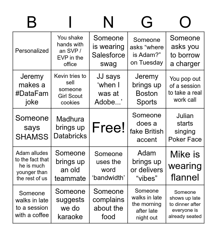 This bingo card has a free space and 44 words: Someone brings up an old teammate, Someone shows up late to dinner after everyone is already seated, Someone complains about the Seattle weather, Someone walks in late to a session with a coffee, Someone changes their flight, Someone walks in late the morning after late night out, Someone is wearing Salesforce swag, Someone asks what time dinner starts, Someone asks you to borrow a charger, Someone suggests we do karaoke, Someone asks “where is Adam?” on Tuesday, Someone does a fake British accent, Someone uses the word ‘bandwidth’, Someone brings up an old teammate, Someone mentions Marc, Someone complains about the food, Someone brings up their kids, Someone says SHAMSS, You come up with our new team name to replace SHAMSS, You pop out of a session to take a real work call, You shake hands with an SVP / EVP in the office, Someone mentions Gertner, Someone mentions not inviting Christine to breakfast, Personalized, Julian says “Cheers”, Julian starts singing Poker Face, Christine makes a sarcastic comment, Christine talks about a previous offsite, Adam brings up or delivers “vibes”, Adam alludes to the fact that he is much younger than the rest of us, Adam talks about his PTO, Mike is wearing flannel, CDG mentions his cats, CDG mentions Sierra, Madhura brings up Databricks, Dan drops the F-bomb, Dan says ‘we should go get a drink’, Someone asks Nazia a question about Seattle, JJ says ‘when I was at Adobe...’, Jeremy makes a #DataFam joke, Jeremy brings up Boston Sports, Vidya says ‘when I was at ServiceNow...”, Kevin tries to sell someone Girl Scout cookies and Dan brings up goat cheese breakfast burritos.