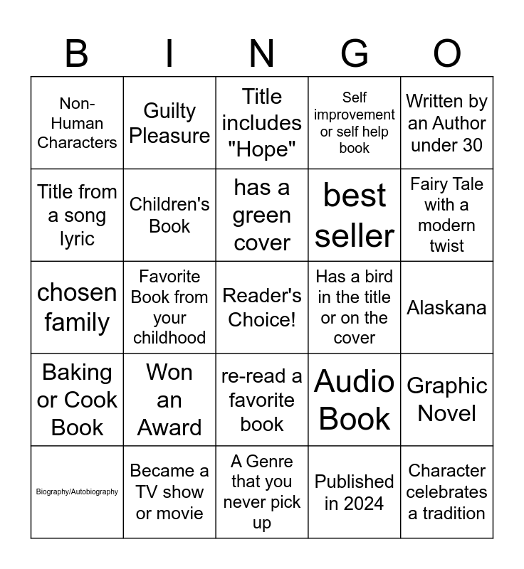 This bingo card has a free space and 24 words: Won an Award, Became a TV show or movie, has a green cover, Biography/Autobiography, Written by an Author under 30, Non-Human Characters, Title from a song lyric, Guilty Pleasure, Has a bird in the title or on the cover, re-read a favorite book, best seller, chosen family, Audio Book, Graphic Novel, Children's Book, Published in 2024, Alaskana, Title includes "Hope", Fairy Tale with a modern twist, Favorite Book from your childhood, Character celebrates a tradition, Baking or Cook Book, Self improvement or self help book and A Genre that you never pick up.
