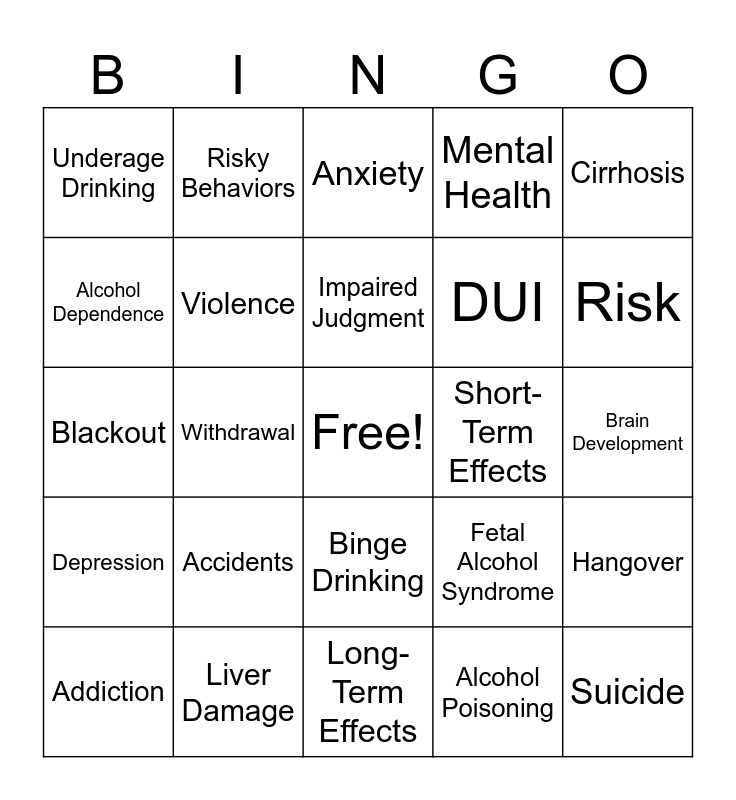 This bingo card has a free space and 26 words: Binge Drinking, Alcohol Poisoning, Impaired Judgment, Liver Damage, Cirrhosis, Underage Drinking, Alcohol Dependence, Risky Behaviors, Brain Development, Fetal Alcohol Syndrome, DUI, Blackout, Hangover, Addiction, Withdrawal, Peer Pressure, Mental Health, Depression, Anxiety, Suicide, Risk, Long-Term Effects, Short-Term Effects, Accidents, Violence and Relationship Problems.