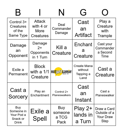 This bingo card has a free space and 24 words: Play an Enchantment, Exile a Spell, Kill a Creature, Buy Someone in Your Pod a Snack or Drink, Play a Creature with Trample, Control 3+ Creatures of the Same Type, Damage an Opponent, Attack with 4 or More Creatures, Create Mana without Tapping a Land, Control 2+ Planeswalkers, Enchant a Creature, Exile a Permanent, Cast an Instant, Cast a Planeswalker, Damage 2+ Opponents in 1 Turn, Play 2+ lands in a Turn, Cast a Creature, Deal Commander Damage, Cast your Commander a Second Time, Block with a 1/1 Creature, Draw a Card Outside of a Your Draw Step, Cast a Sorcery, Cast an Artifact and Buy someone a TCG Pack.