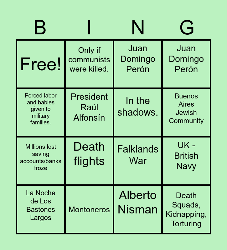 This bingo card has 16 words: La Noche de Los Bastones Largos, Montoneros, Juan Domingo Perón, Juan Domingo Perón, Forced labor and babies given to military families., Only if communists were killed., Falklands War, UK - British Navy, Free!, President Raúl Alfonsín, Alberto Nisman, Buenos Aires Jewish Community, Millions lost saving accounts/banks froze, Death flights, In the shadows. and Death Squads, Kidnapping, Torturing.