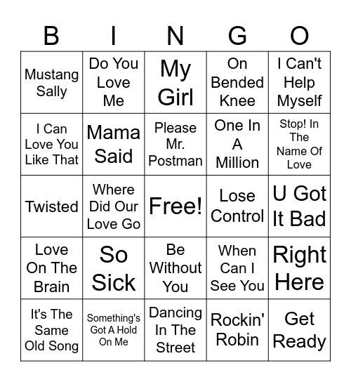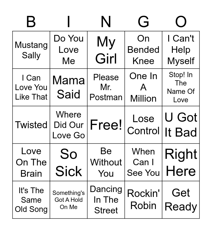 This bingo card has a free space and 74 words: Motownphilly, Ain't No Mountain High Enough, My Girl, I'll Make Love To You, Respect, I Want You Back, End Of The Road, I'm Coming Out, It's The Same Old Song, Tell Me It's Real, Part-Time Lover, Sexual Healing, Please Mr. Postman, I Can Love You Like That, If I Ever Fall In Love, Where Did Our Love Go, Let's Get It On, Stop! In The Name Of Love, It's So Hard To Say Goodbye To Yesterday, Twisted, Mama Said, Do You Love Me, On Bended Knee, Ain't Too Proud To Beg, Get Ready, Upside Down, One Sweet Day, Think, At Last, Feeling Good, I Can't Help Myself, Build Me Up Buttercup, Stand by Me, I Heard It Through The Grapevine, When a Man Loves a Woman, Rockin' Robin, I Swear, Baby Love, You've Really Got A Hold On Me, These Boots Are Made For Walking, Dancing In The Street, Something's Got A Hold On Me, War, Dance to the Music, Higher Ground, Mustang Sally, Kiss from a Rose, So Sick, Give Me Everything, Time of Our Lives, Don't Leave Me, Burn, U Got It Bad, One More Chance, I'm Goin' Down, Back At One, Be Without You, Doo Wop, We Gonna Take U Back, Right Here, One In A Million, The Boy Is Mine, Love On The Brain, Let Me Love You, Lose Control, Best of My Love, Waterfalls, Endless Love, When Can I See You, How Do U Want It, All My Life, I Wanna Know, Love Like This and Let's Stay Together.
