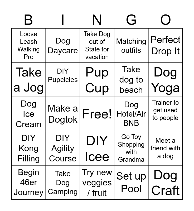 This bingo card has a free space and 24 words: DIY Agility Course, Take Dog Camping, Pup Cup, Begin 46er Journey, Perfect Drop It, Loose Leash Walking Pro, Take a Jog, Dog Daycare, Dog Hotel/Air BNB, DIY Icee, Take dog to beach, Dog Ice Cream, Go Toy Shopping with Grandma, Meet a friend with a dog, DIY Pupcicles, Set up Pool, Trainer to get used to people, Take Dog out of State for vacation, Dog Yoga, Make a Dogtok, Dog Craft, DIY Kong Filling, Matching outfits and Try new veggies / fruit.