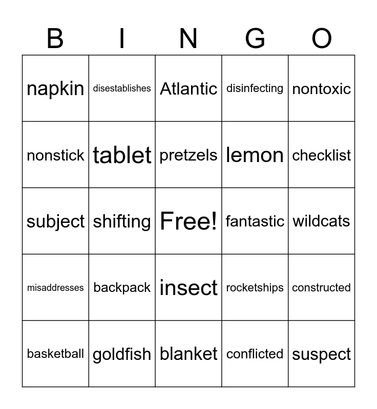 This bingo card has a free space and 24 words: backpack, goldfish, pretzels, basketball, nontoxic, napkin, nonstick, disestablishes, fantastic, insect, lemon, subject, rocketships, constructed, tablet, conflicted, wildcats, Atlantic, checklist, shifting, suspect, misaddresses, disinfecting and blanket.