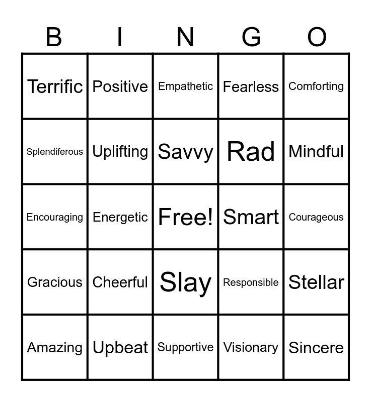 This bingo card has a free space and 24 words: Amazing, Cheerful, Savvy, Visionary, Comforting, Terrific, Positive, Empathetic, Smart, Courageous, Encouraging, Uplifting, Responsible, Stellar, Splendiferous, Upbeat, Supportive, Fearless, Mindful, Gracious, Energetic, Slay, Rad and Sincere.