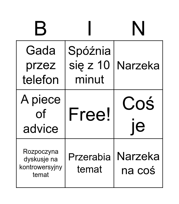 This bingo card has a free space and 8 words: Coś je, Narzeka, Spóźnia się z 10 minut, Rozpoczyna dyskusje na kontrowersyjny temat, Gada przez telefon, Narzeka na coś, A piece of advice and Przerabia temat.