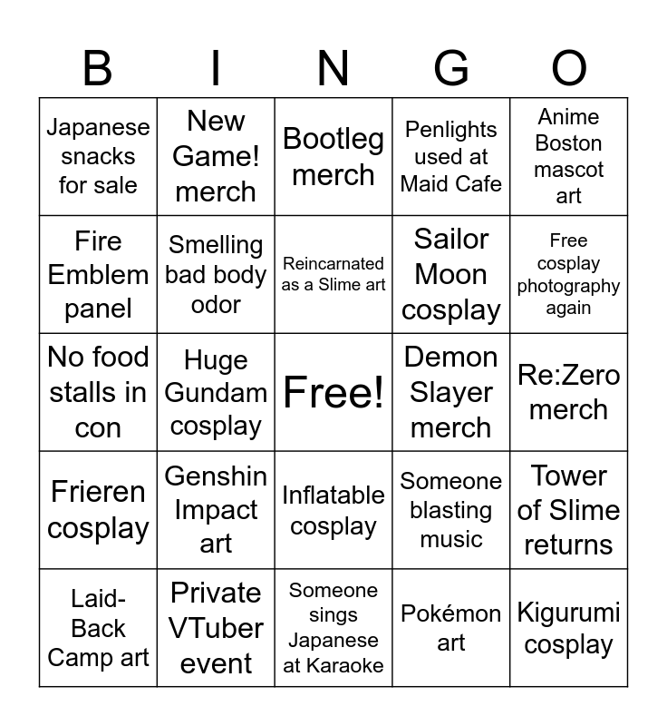 This bingo card has a free space and 24 words: Laid-Back Camp art, Genshin Impact art, Reincarnated as a Slime art, Pokémon art, Anime Boston mascot art, Japanese snacks for sale, New Game! merch, Bootleg merch, Demon Slayer merch, Re:Zero merch, No food stalls in con, Smelling bad body odor, Someone blasting music, Tower of Slime returns, Fire Emblem panel, Private VTuber event, Someone sings Japanese at Karaoke, Penlights used at Maid Cafe, Free cosplay photography again, Frieren cosplay, Huge Gundam cosplay, Inflatable cosplay, Sailor Moon cosplay and Kigurumi cosplay.