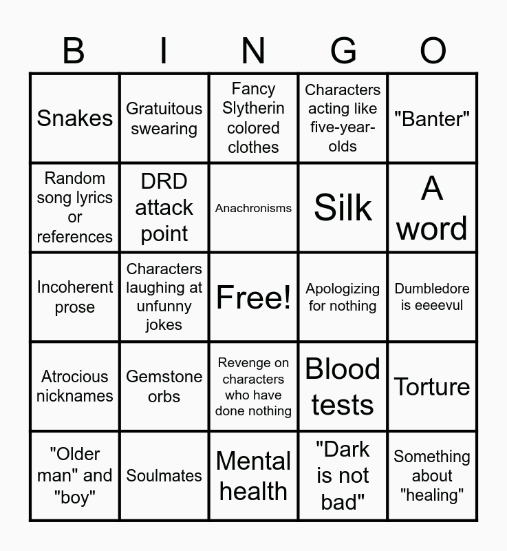This bingo card has a free space and 29 words: "Older man" and "boy", Non sequiturs, Characters laughing at unfunny jokes, Impossible descriptions, Snakes, Fancy Slytherin colored clothes, DRD attack point, Gemstone orbs, Apologizing for nothing, Soulmates, Dumbledore is eeeevul, Something about "healing", Mental health, "Dark is not bad", A word, Deep voices, Revenge on characters who have done nothing, Atrocious nicknames, "Banter", Incoherent prose, Blood tests, Original magic, Silk, Random song lyrics or references, Characters acting like five-year-olds, Gratuitous swearing, Torture, Anachronisms and Tom-ato.