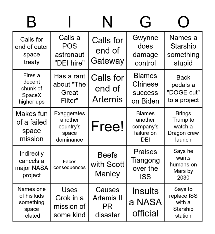 This bingo card has a free space and 24 words: Faces consequences, Uses Grok in a mission of some kind, Calls for end of Artemis, Names one of his kids something space related, Names a Starship something stupid, Calls for end of outer space treaty, Fires a decent chunk of SpaceX higher ups, Calls a POS astronaut "DEI hire", Blames another company's failure on DEI, Beefs with Scott Manley, Blames Chinese success on Biden, Makes fun of a failed space mission, Praises Tiangong over the ISS, Says he wants humans on Mars by 2030, Has a rant about "The Great Filter", Insults a NASA official, Brings Trump to watch a Dragon crew launch, Calls for end of Gateway, Back pedals a "DOGE cut" to a project, Exaggerates another country's space dominance, Says to replace ISS with a Starship station, Indirectly cancels a major NASA project, Gwynne does damage control and Causes Artemis II PR disaster.