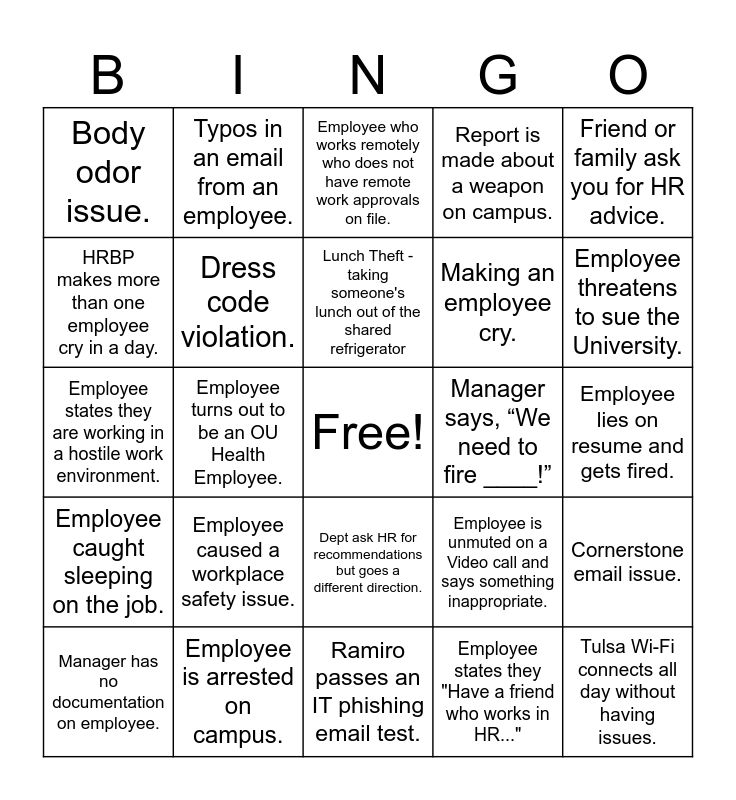 This bingo card has a free space and 34 words: Employee refused to sign their termination., Employee states they "Have a friend who works in HR...", Employee references the 1st amendment., Employee caught drinking on the job., Employee caught sleeping on the job., Dress code violation., Friend or family ask you for HR advice., Manager has no documentation on employee., Typos in an email from an employee., Caught posting pics on social media while taking FMLA., Lunch Theft - taking someone's lunch out of the shared refrigerator, Employee who works remotely who does not have remote work approvals on file., Managers skipping straight to a final for something mundane., Terming someone without HR approval., Manager says, “We need to fire ____!”, Employee threatens to sue the University., Employee is arrested on campus., Employee states they are working in a hostile work environment., Employee caused a workplace safety issue., Employee is unmuted on a Video call and says something inappropriate., Dept ask HR for recommendations but goes a different direction., Employee is caught entering false time worked., Body odor issue., Employee lies on resume and gets fired., Ramiro passes an IT phishing email test., Tulsa Wi-Fi connects all day without having issues., Report is made about a weapon on campus., Employee punches something/someone., Making an employee cry., HRBP makes more than one employee cry in a day., Employee makes an HRBP cry., Employee turns out to be an OU Health Employee., Cornerstone email issue. and Employee replies to and OU alert..