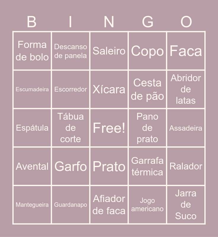 This bingo card has a free space and 40 words: Colher, Espátula, Toalha de mesa, Escorredor, Guardanapo, Prato, Xícara, Açucareiro, Faca, Avental, Tábua de corte, Copo, Jarra de Suco, Assadeira, Pano de prato, Garfo, Concha, Forma de bolo, Queijeira, Saleiro, Ralador, Jogo americano, Cesta de pão, Escumadeira, Caneca, Pegador, Pote hermético, Porta-tempero, Fouet, Galheteiro, Descascador de legumes, Mantegueira, Bandeja, Garrafa térmica, Abridor de latas, Afiador de faca, Espremedor de alho, Centrífuga de salada, Descanso de panela and Escorredor de macarrão.