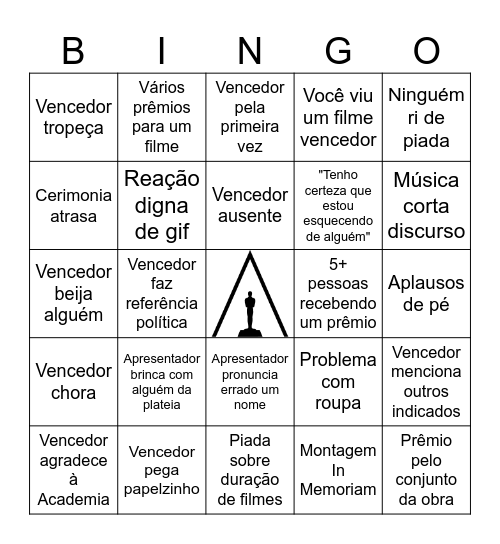 This bingo card has a free space and 24 words: Vencedor agradece à Academia, Apresentador brinca com alguém da plateia, Vencedor ausente, Montagem In Memoriam, Ninguém ri de piada, Vencedor tropeça, Vários prêmios para um filme, Vencedor pela primeira vez, 5+ pessoas recebendo um prêmio, Aplausos de pé, Vencedor beija alguém, Reação digna de gif, Problema com roupa, Vencedor menciona outros indicados, Cerimonia atrasa, Vencedor pega papelzinho, Piada sobre duração de filmes, Você viu um filme vencedor, Música corta discurso, Vencedor chora, Vencedor faz referência política, Apresentador pronuncia errado um nome, "Tenho certeza que estou esquecendo de alguém" and Prêmio pelo conjunto da obra.