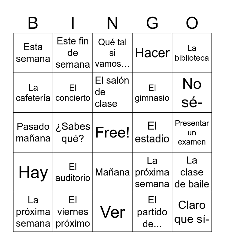 This bingo card has a free space and 24 words: El auditorio, El viernes próximo, El salón de clase, La próxima semana, La biblioteca, Esta semana, La cafetería, Este fin de semana, El estadio, Mañana, El gimnasio, Pasado mañana, La próxima semana, La clase de baile, El concierto, El partido de..., Presentar un examen, Qué tal si vamos…, No sé-, ¿Sabes qué?, Claro que sí-, Hay, Hacer and Ver.