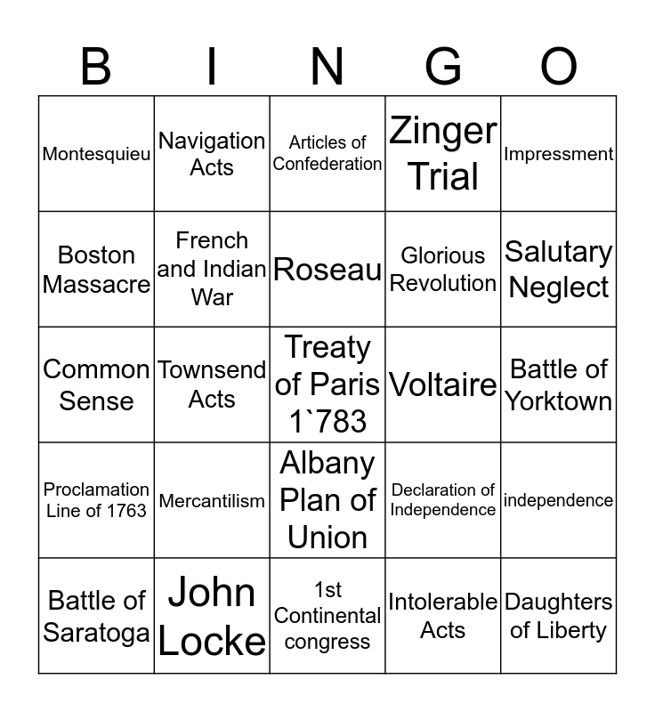 This bingo card has a free space and 24 words: Mercantilism, John Locke, Roseau, Battle of Saratoga, Impressment, Montesquieu, Boston Massacre, Navigation Acts, Voltaire, Albany Plan of Union, Glorious Revolution, Common Sense, Declaration of Independence, independence, French and Indian War, Intolerable Acts, Battle of Yorktown, Articles of Confederation, Salutary Neglect, Townsend Acts, Daughters of Liberty, Proclamation Line of 1763, Zinger Trial and 1st Continental congress.