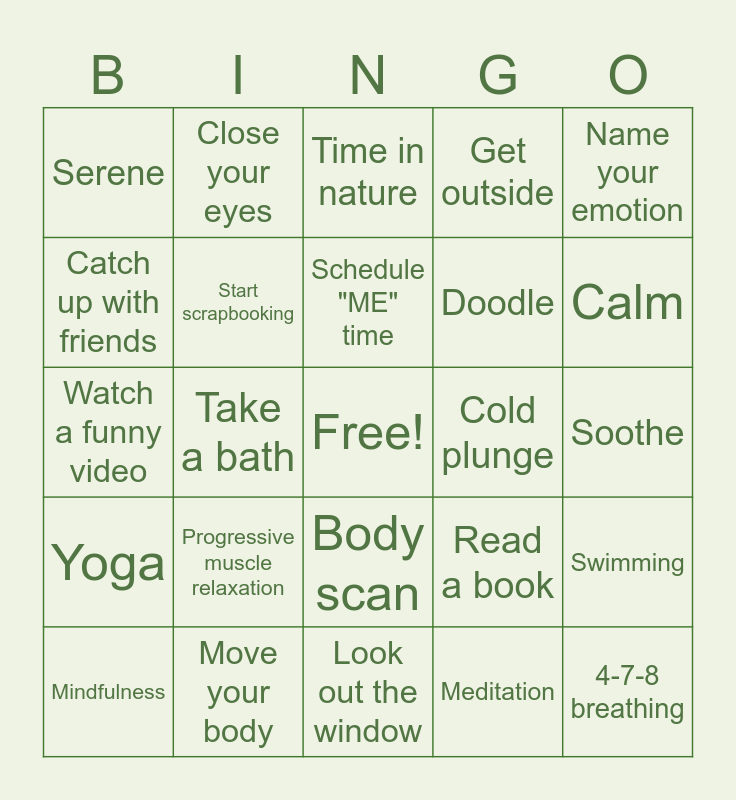 This bingo card has a free space and 44 words: Box breathing, 4-7-8 breathing, Belly breathing, Mindfulness, Mind body connection, Meditation, Time in nature, Awe, Name your emotion, Move your body, Get outside, Cold plunge, Body scan, Progressive muscle relaxation, Take a walk, Look out the window, Notice your surroundings, Watch a funny video, Breathe, Calm, Close your eyes, Pet an animal, Peaceful, Serene, Tranquil, Soothe, Schedule microbreaks, Eat lunch outside, Read a book, Yoga, Spa, Swimming, Step away from your screens, Reduce phone time, Take a bath, Light a candle, Apply some lavender oil to your wrist, Gratitude journaling, Schedule "ME" time, Catch up with friends, Doodle, Start journaling, Start scrapbooking and Daily affirmations.